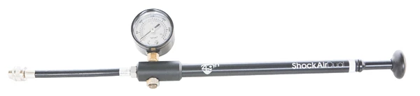 A dual-purpose suspension fork / rear shock pump with a unique dual pressure gauge design to facilitate fine-tuning of the unique air pressure requirements for each shock. Eliminates the need for 2 shock pumps.