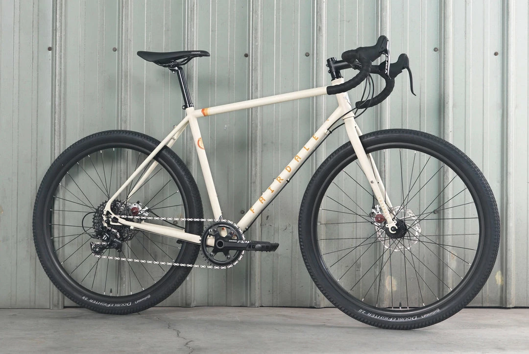 This is our top of the line Weekender, and it comes equipped with an amazing parts build, like a SRAM Apex 1x derailleur and shifter, Avid disc brakes, FSA cranks and wider tires.