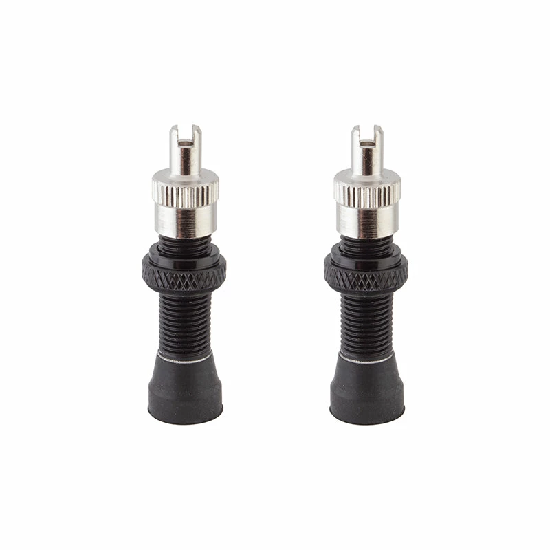 - Tubeless Schrader valves made from lightweight alloy with removable cores