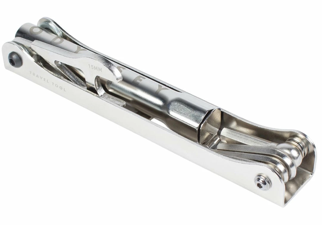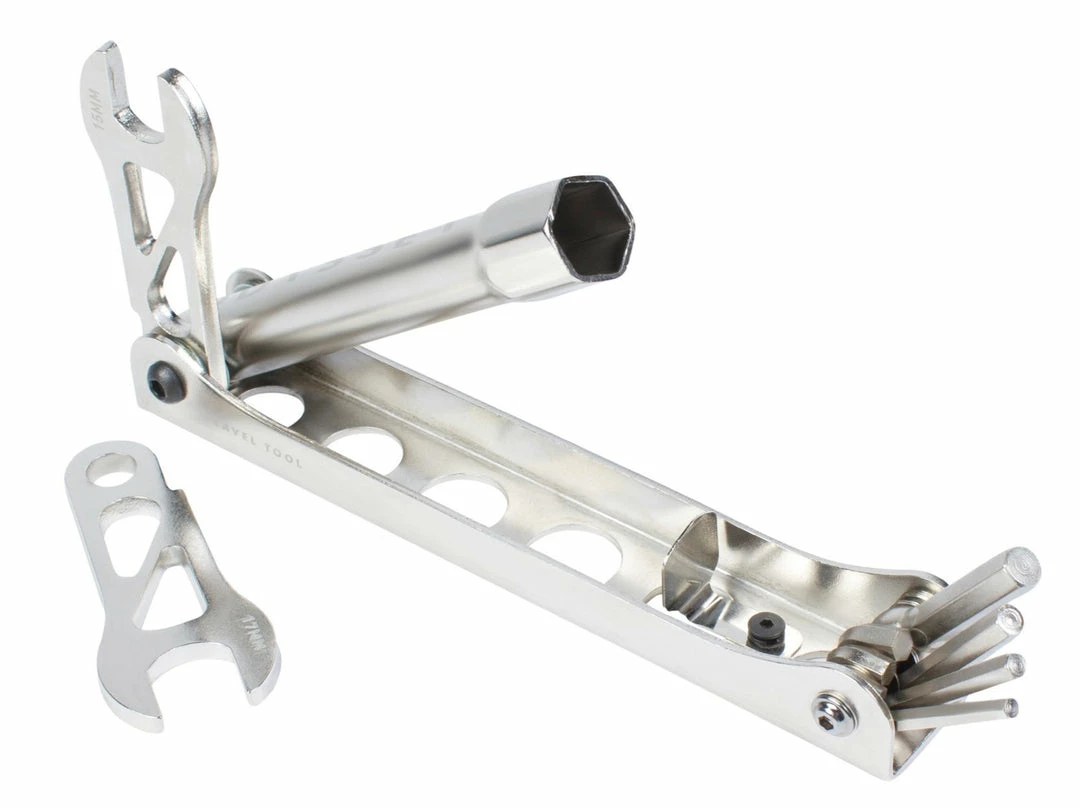 Our first multi-tool includes all the key bits to assemble and disassemble your bike on-the-go. Includes a pedal wrench, 4, 5, 6 and 8mm hex wrenches and a 17mm socket with an integrated storage compartment. It’s light and easy to carry, but big enough to allow you to actually tighten everything down properly.