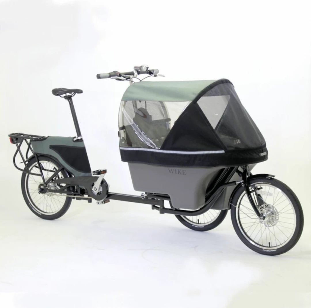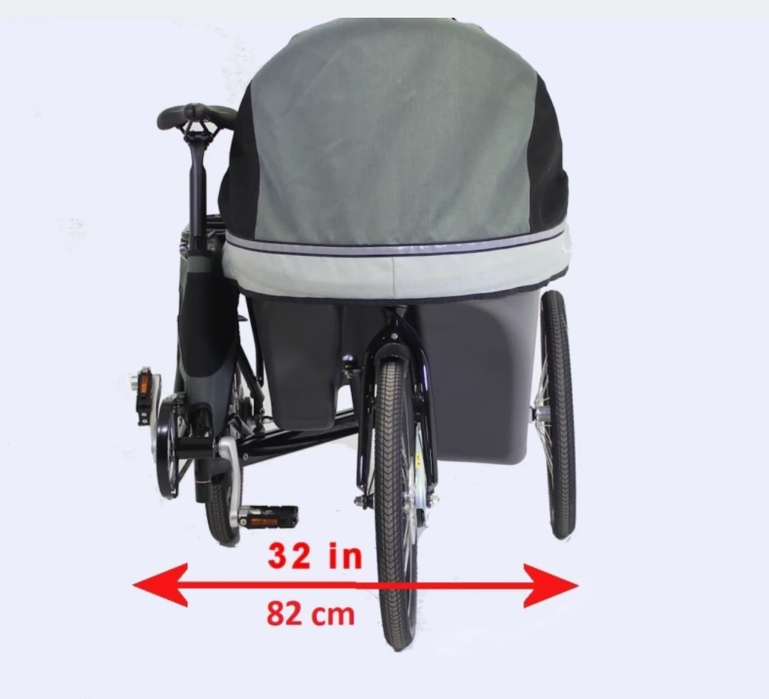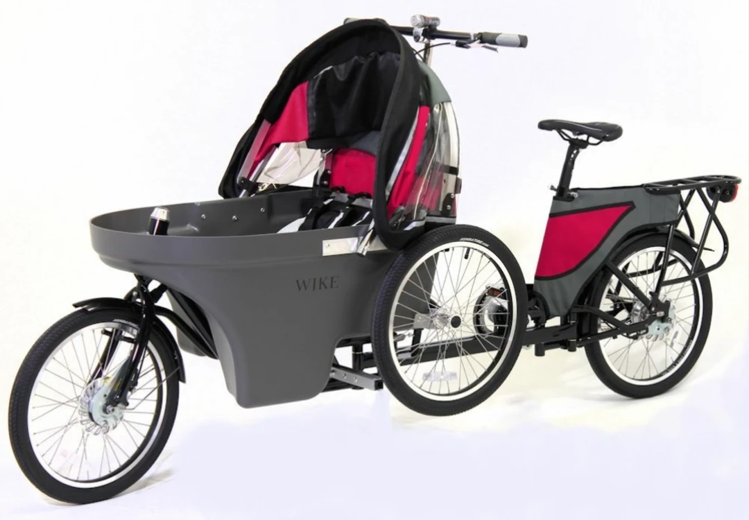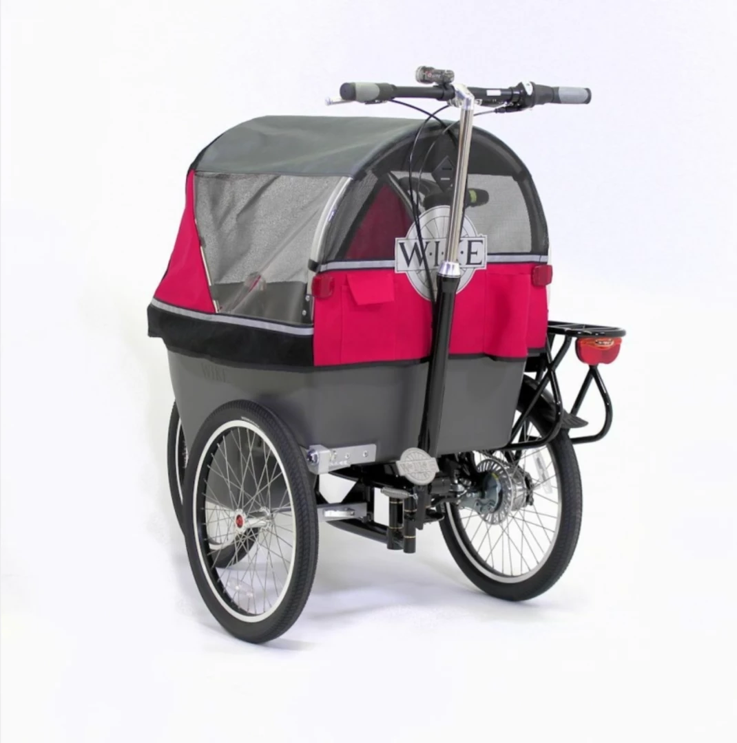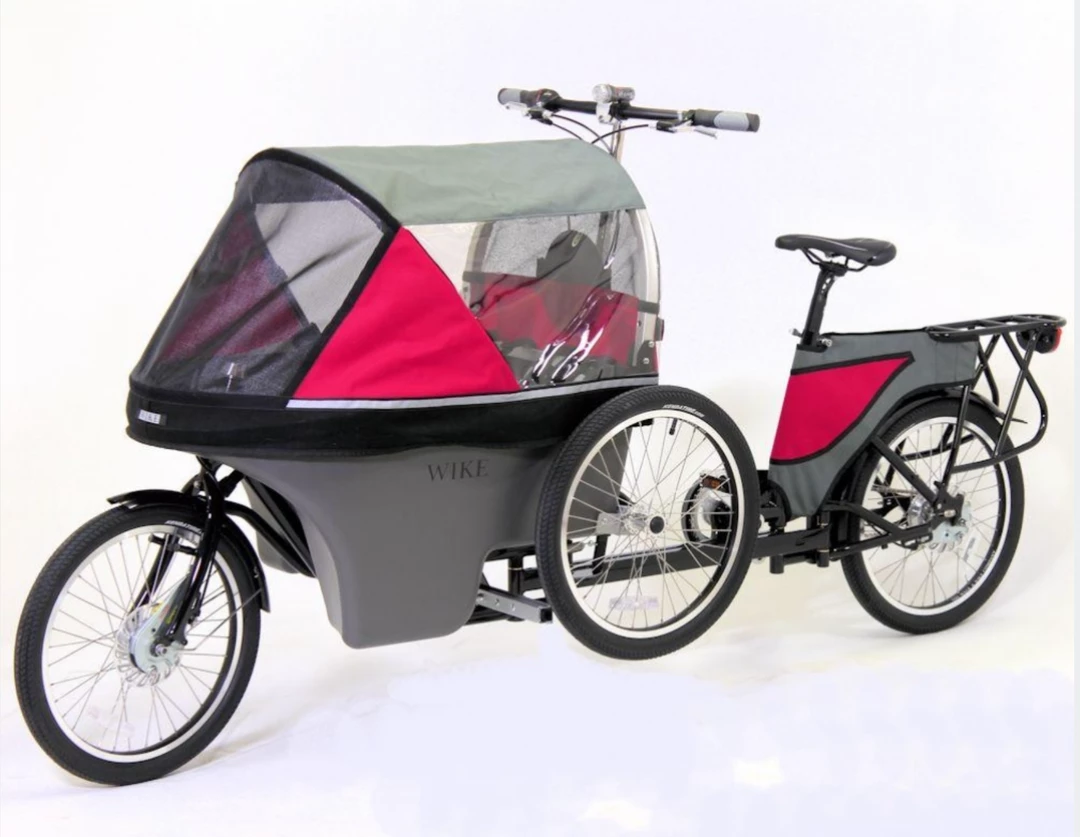 The bicycle frame is high gloss black on 4130 tig welded alloy steel with the ability to upgrade from the roller brake to disc or caliper brakes on the front wheel, or to disc on the back wheel. The carrier is an ABS plastic pod with an adjustment for two seat heights. All bicycle parts are standard and can be serviced locally. The seating provided can easily be removed and a car seat may be strapped to the floor of the pod.Β