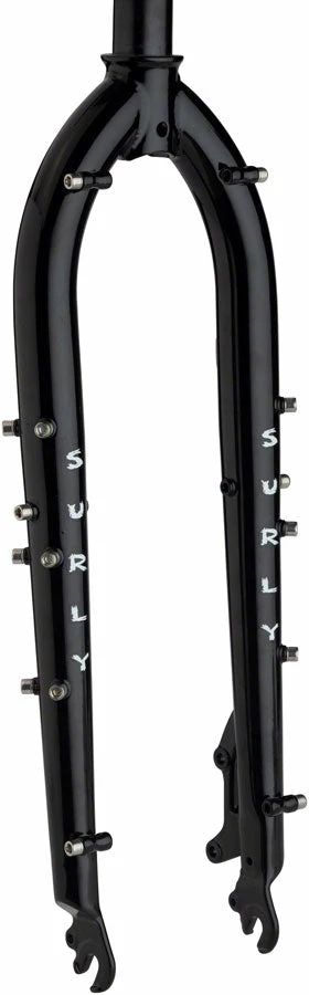 The ECR fork features accommodations for a rack and fenders, a set of Three-Pack cage mounts on each leg, disc brake mounts and brake line guides. Constructed using the same 4130 CroMoly steel as Surly’s frames and forks, with an 1-1/8″ steerer.